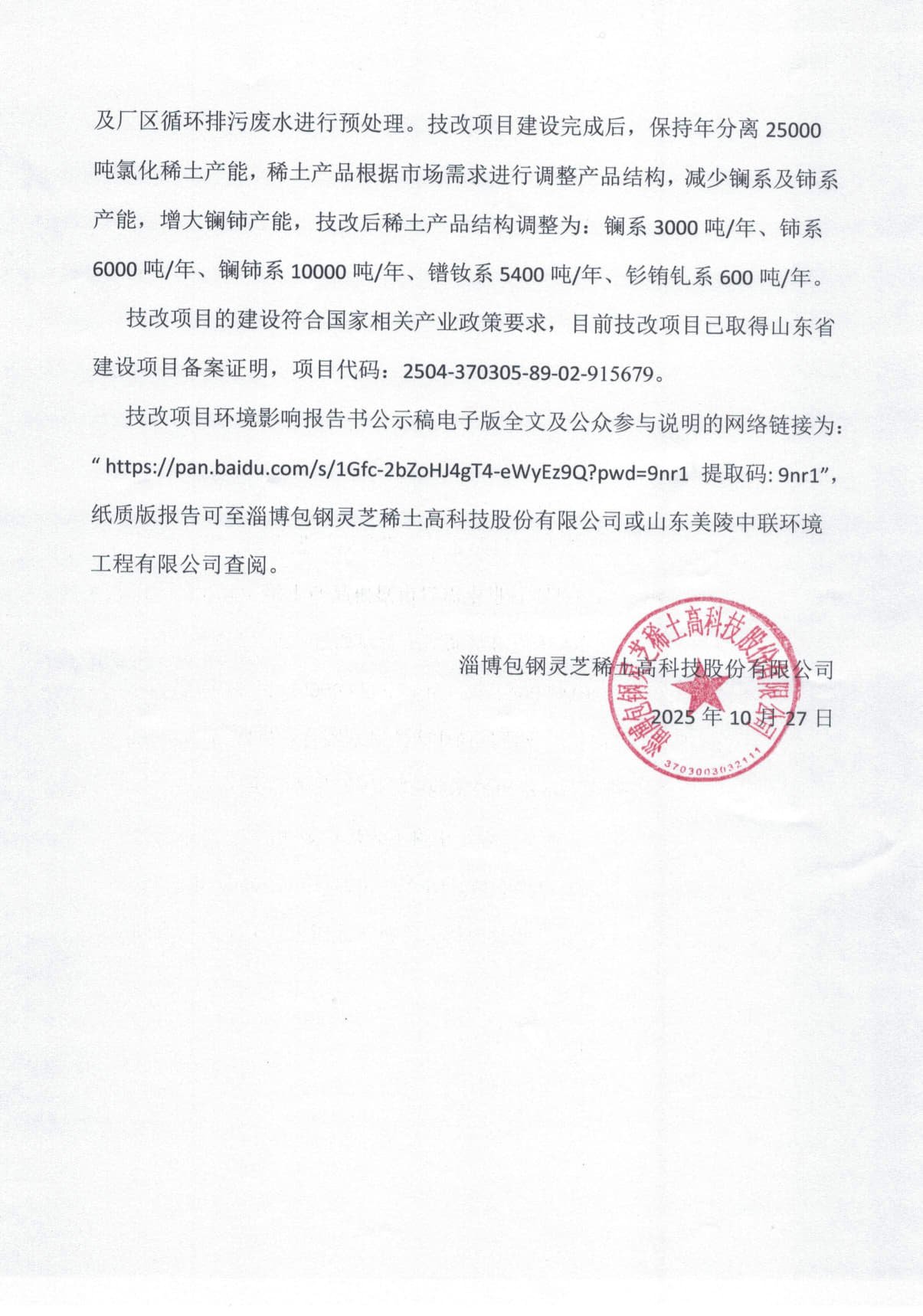 淄博包鋼靈芝稀土高科技股份有限公司25000噸/年氯化稀土產品質量和環保提升技術改造項目環境影響評價擬報批前公示